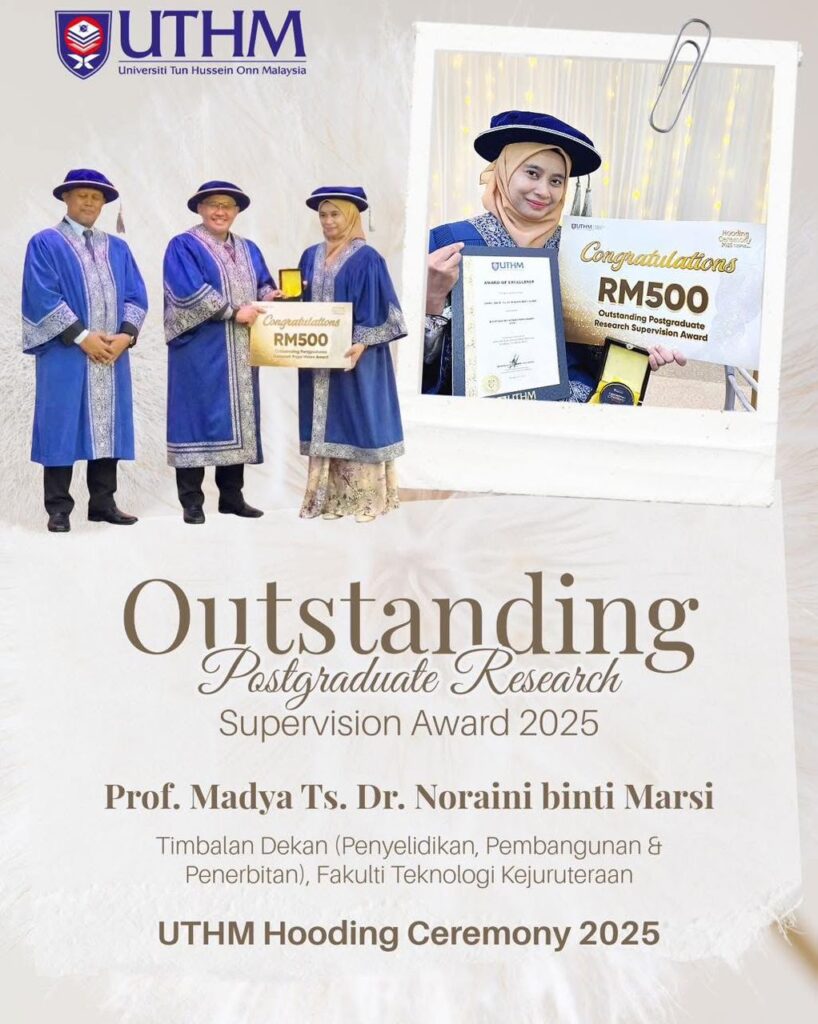 Anugerah ini menjadi pengiktirafan kepada kecemerlangan beliau dalam penyeliaan penyelidikan pascasiswazah serta komitmen berterusan dalam memacu budaya akademik berkualiti tinggi di FTK UTHM.